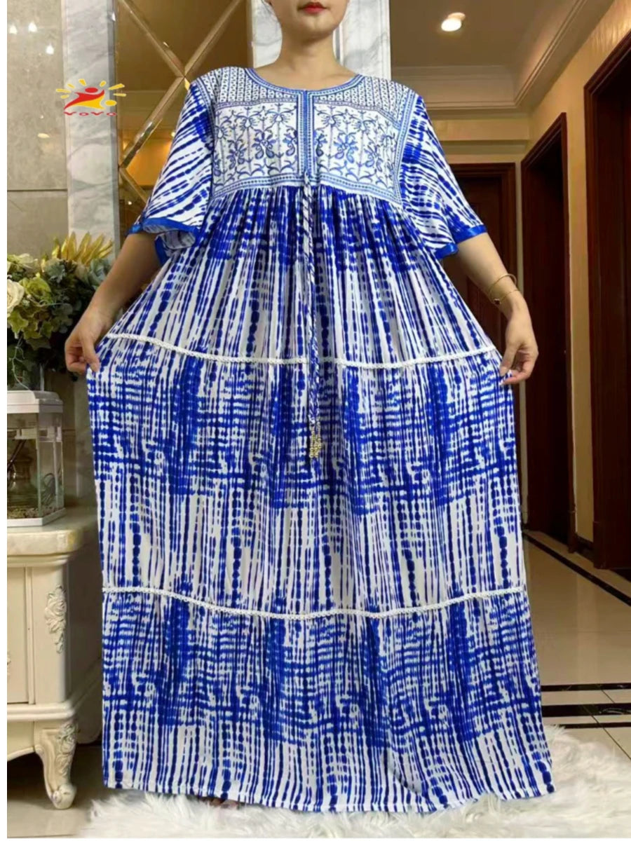 2025 New Muslim Abaya Summer Dress Short Sleeve Collect Waist Floral Loose Boubou Maxi Islam Women Dress African Abaya Clothing
